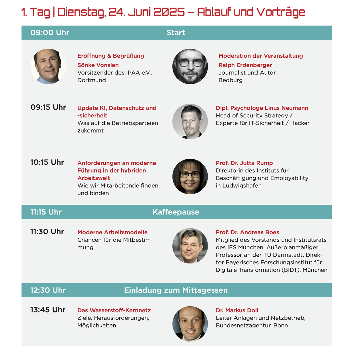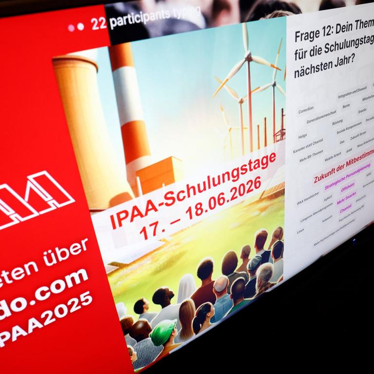 Eine professionelle Moderation, ein attraktives Rahmenprogramm und eine ausgezeichnete Bewirtung runden das Veranstaltungs- und Tagungserlebnis erfolgreich ab. Unsere "IPAA-Schulungstage" gelten nicht umsonst seit jeher als das Netzwerk- und Diskussionsforum der Arbeitnehmervertreter*innen von über 150.000 Beschäftigten in der Energiewirtschaft.